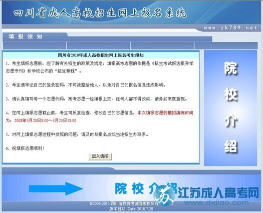 考生在每次登录网上成人报名系统时进入该页面,如下图所示: